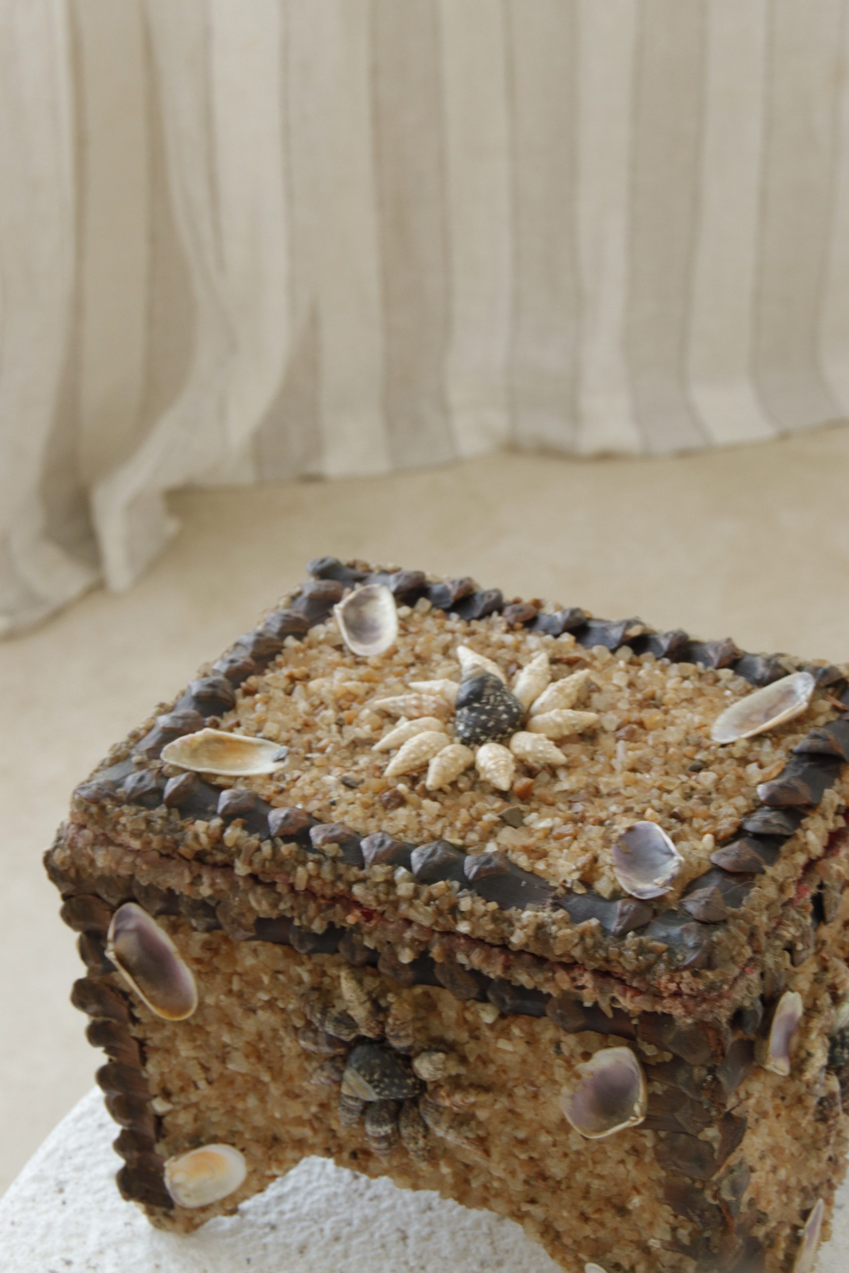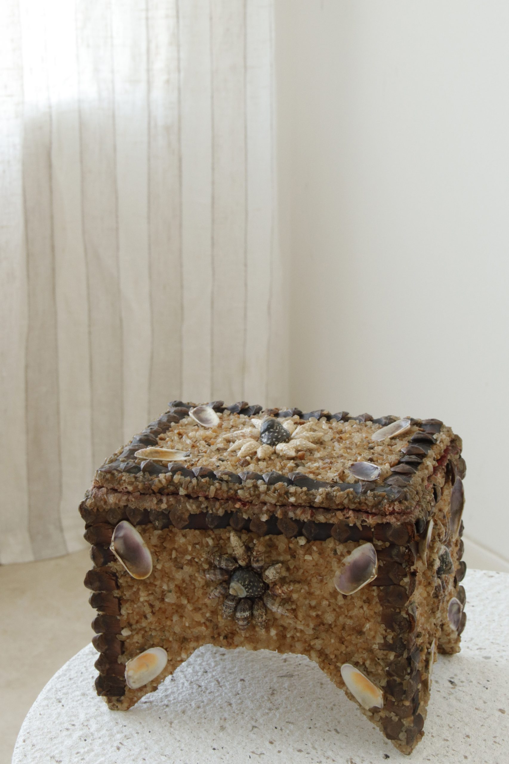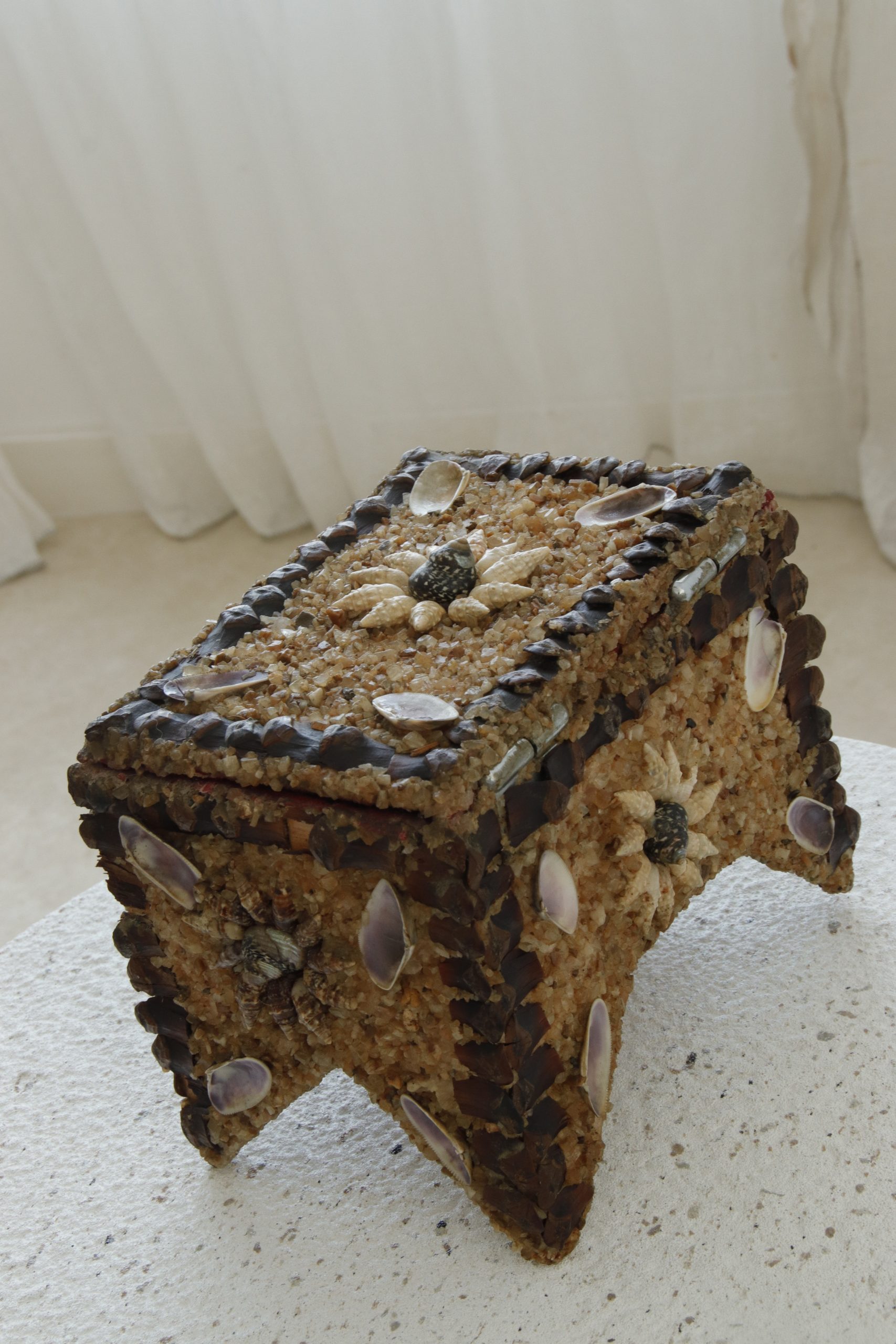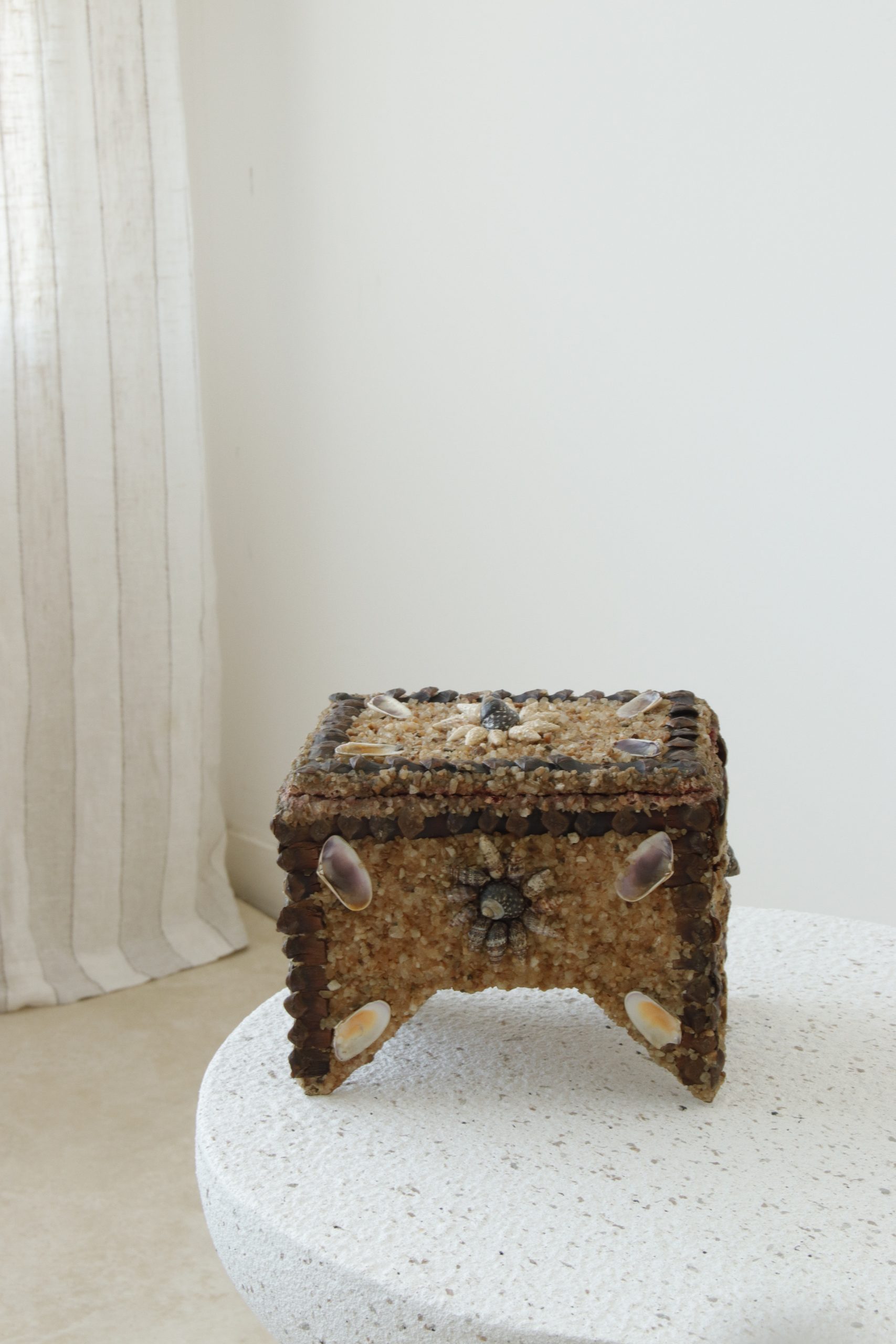 Découvrez notre ancienne boîte à bijoux incrustée de vrais coquillages et de grains de sable, détails des contours avec des écorces de pomme de pin. Cette pièce unique marie l’art traditionnel de l’artisanat à des matériaux naturels.