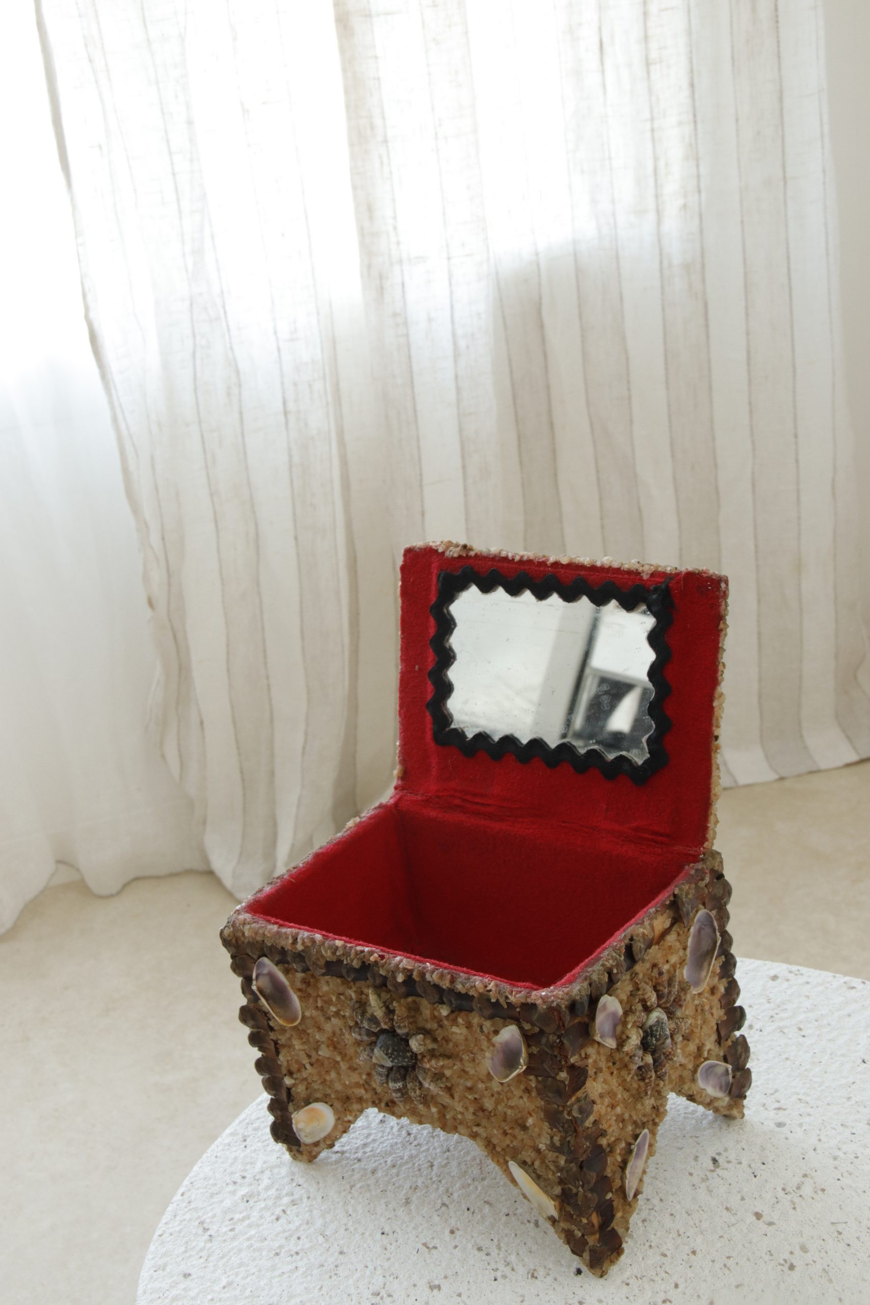 Fabriquée sur une base en bois solide. Ouvrez le couvercle orné de coquillages pour révéler un intérieur en velours rouge. Ce luxueux écrin offre une douce doublure qui préserve vos bijoux, tout en ajoutant une touche de sophistication à votre routine de rangement.