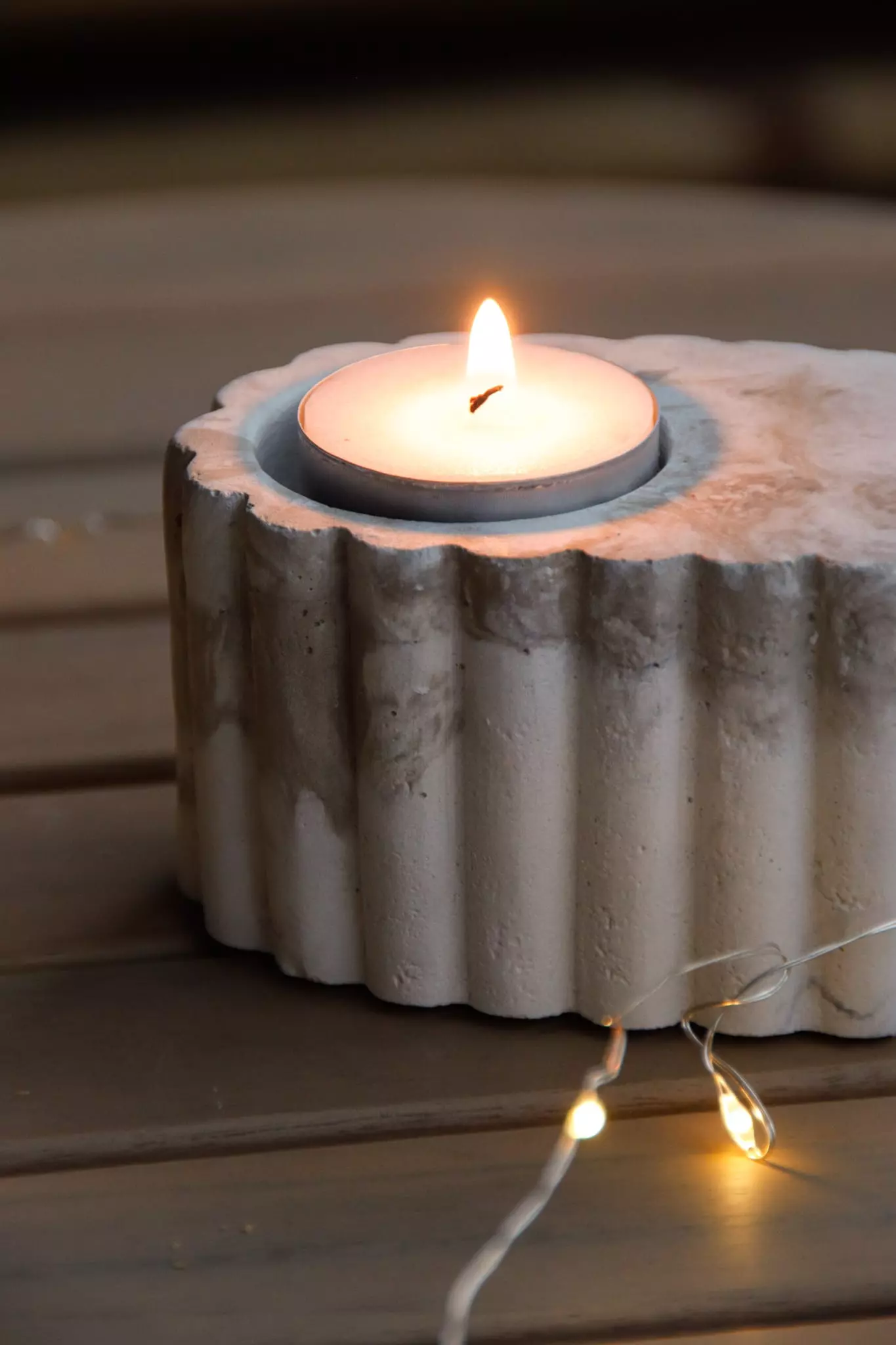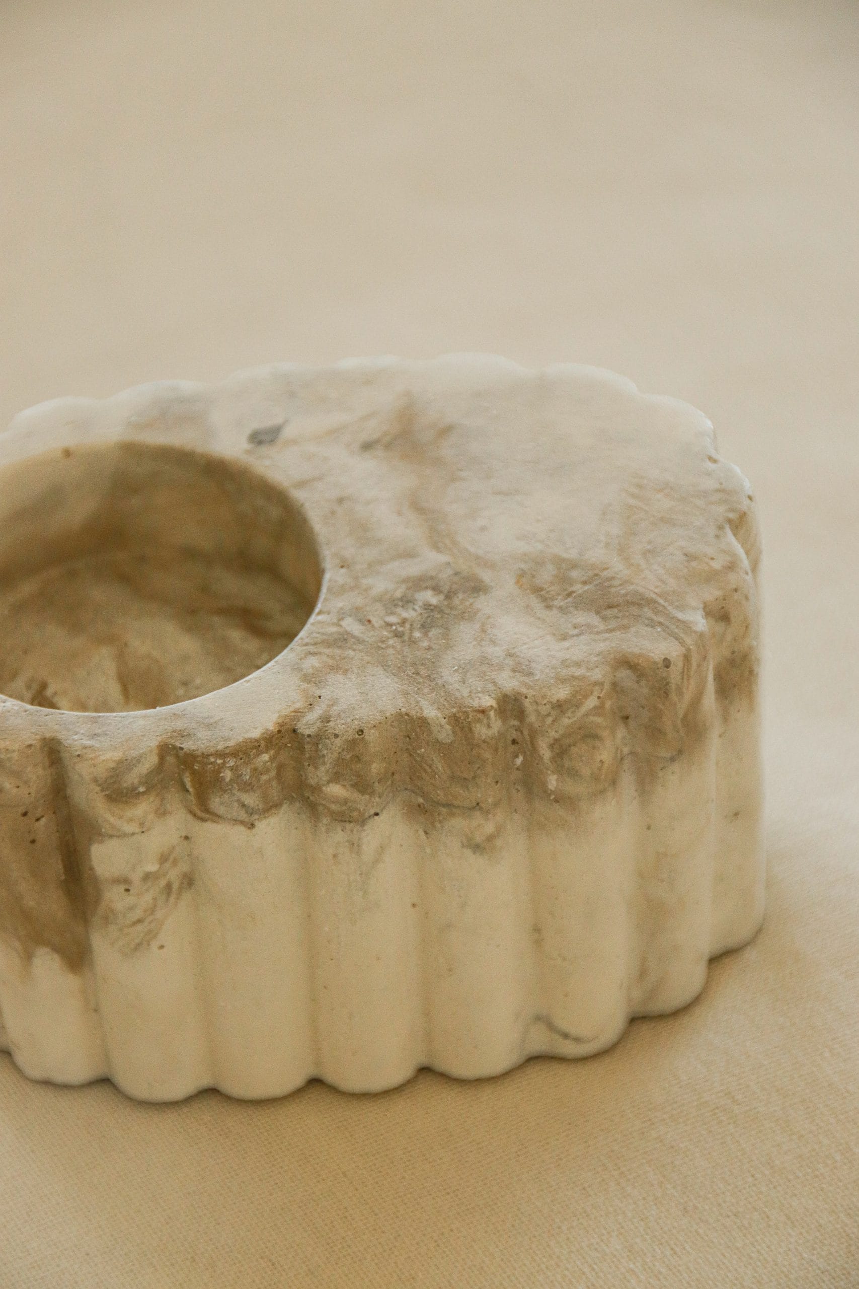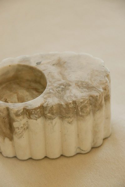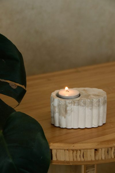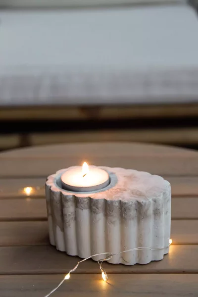 Bougeoir en ciment marbré, parfait pour une bougie chauffe‑plat. Compact, il tient bien en place, même à l’extérieur, grâce à une base lourde. Les stries tout autour apportent une texture simple et élégante, idéale pour jouer avec la lumière.