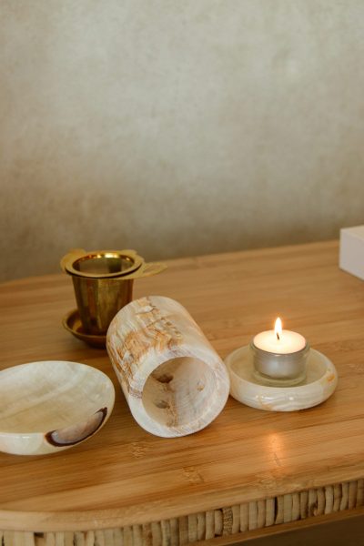 Vous pouvez le disposer de plusieurs façons ill accueille une petite coupelle pour y déposer une senteur à brûler ou diffuser de l’huile essentielle. Le cylindre accueillera votre bougie et fera office de photophore pour une ambiance douce et tamisée.