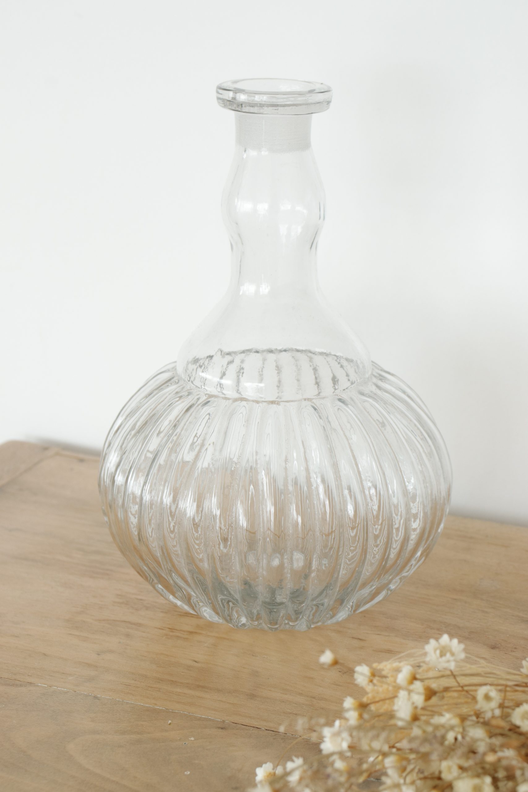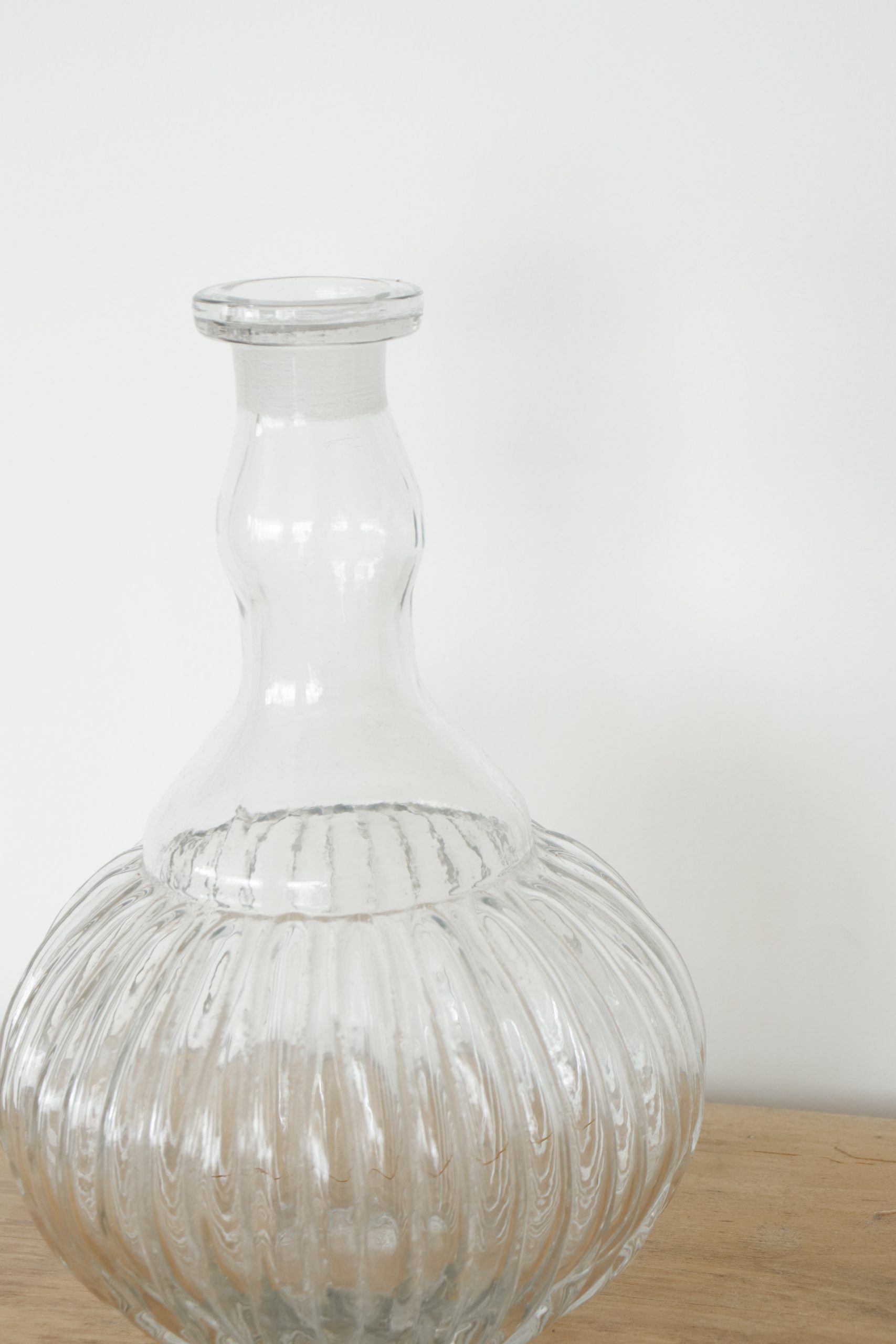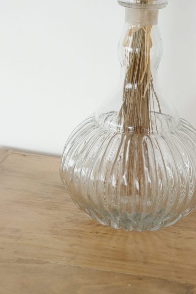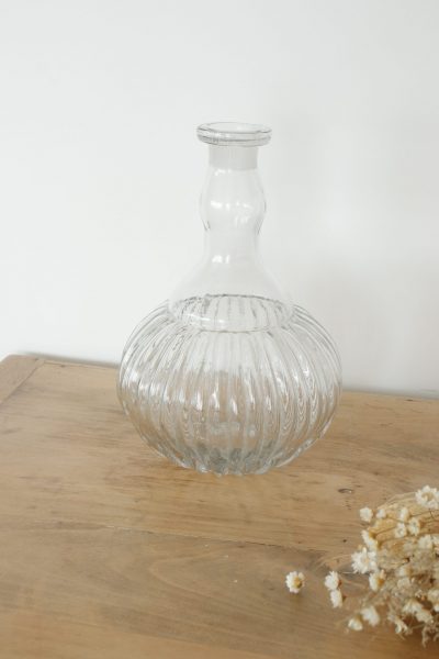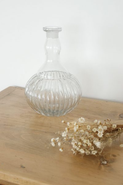 Jolie carafe en verre ciselé ancienne, à détourner en vase. On aime sa forme atypique qui fait tout son charme.