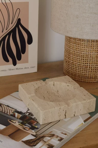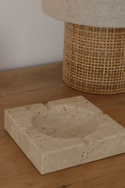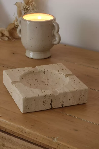 Ce cendrier vintage en travertin, avec ses 4 inserts situés de chaque côté pour y déposer les cigarettes, est une pièce élégante et solide. Ce matériaux très actuel est esthétique, et résistant aux intempéries, pour par exemple, une utilisation en extérieur. Facile à nettoyer à l’eau, il conserve son aspect authentique au fil du temps. Ce cendrier apportera une touche rétro chic à vos espaces de vie et fera sensation lors de vos soirées entre ami.e.s.