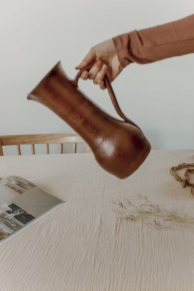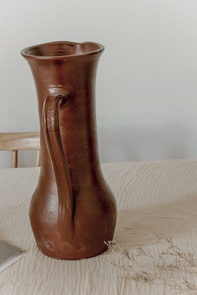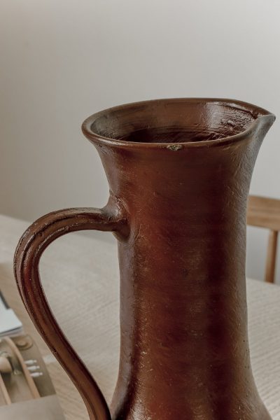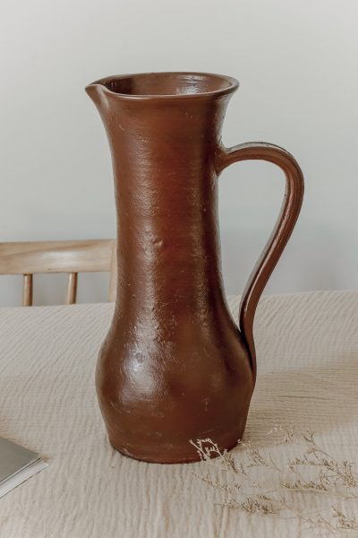 Grand pichet en grès artisanal tourné à la main pouvant également servir de vase. Pièce pleine de charme pas ses petites imperfections laissant entrevoir tout le travail à la main. Emaillé dans une teinte bordeaux.