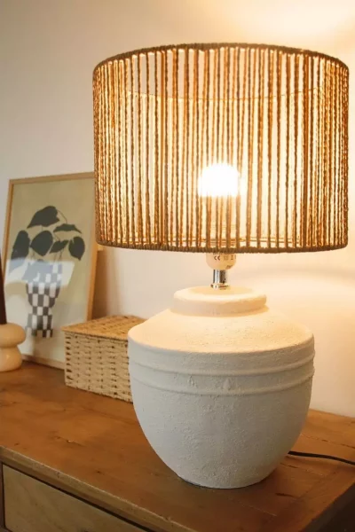 Lampe à poser upcyclée socle texturé blanc et abat-jour en corde