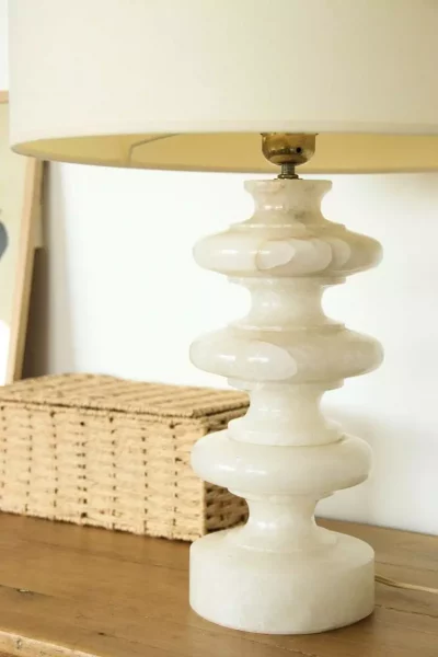Très belle lampe vintage au pied sculpté dans l’albâtre blanc, évoquant des vagues douces et organiques. Un design intemporel, qui correspond aux tendances actuelles. L’abat-jour d’origine, en tissu crème, diffuse une lumière chaleureuse et douce. Câble d’époque en plastique jaune, typique des années 70. Fonctionne parfaitement avec une ampoule à culot E27 (ampoule non fournie).