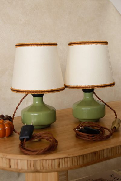 Deux lampes à poser des années 70 au charme rétro, proposées en lot de deux. Leurs pieds en verre vert apportent une touche délicate de couleur, tandis que les abats-jours crème à liseré en coton marron et doré diffusent une lumière douce et chaleureuse.