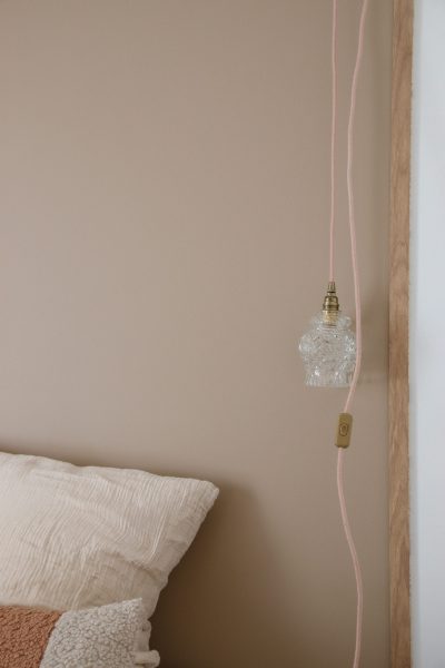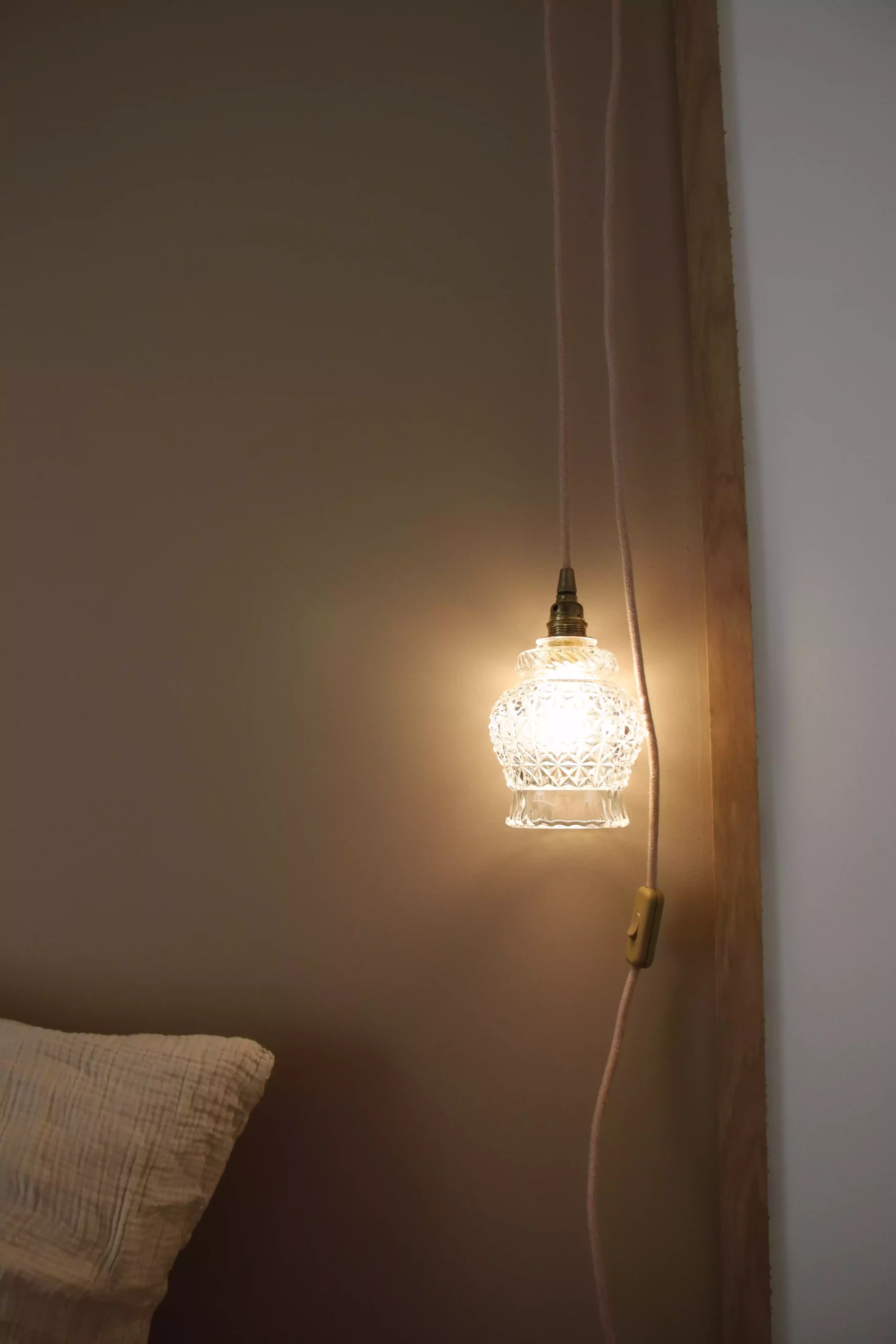 Cette paire de baladeuses vintage présente des abat-jours en verre ciselé, créant de magnifiques motifs lumineux une fois allumés, apportant une ambiance chaleureuse et tamisée. Les câbles en tissu vieux rose ajoutent une touche de douceur et d’élégance, tandis que les douilles dorées complètent le look rétro chic.
