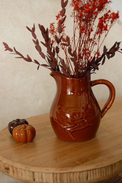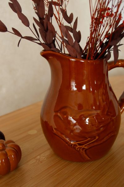 Pichet Saint-Clément signé Chardonneret du Vercor, en faïence brun, avec un oiseau en relief très décoratif. Il peut servir aussi bien pour verser de l’eau que comme vase pour fleurs séchées ou fraîches, ou simplement comme objet décoratif. Le relief de l’oiseau apporte du volume, de la texture, et un charme rustique qui attire l’œil.