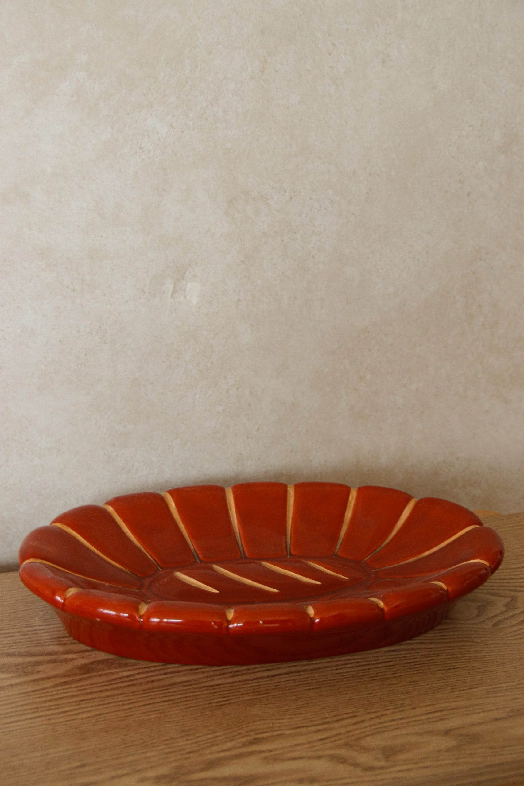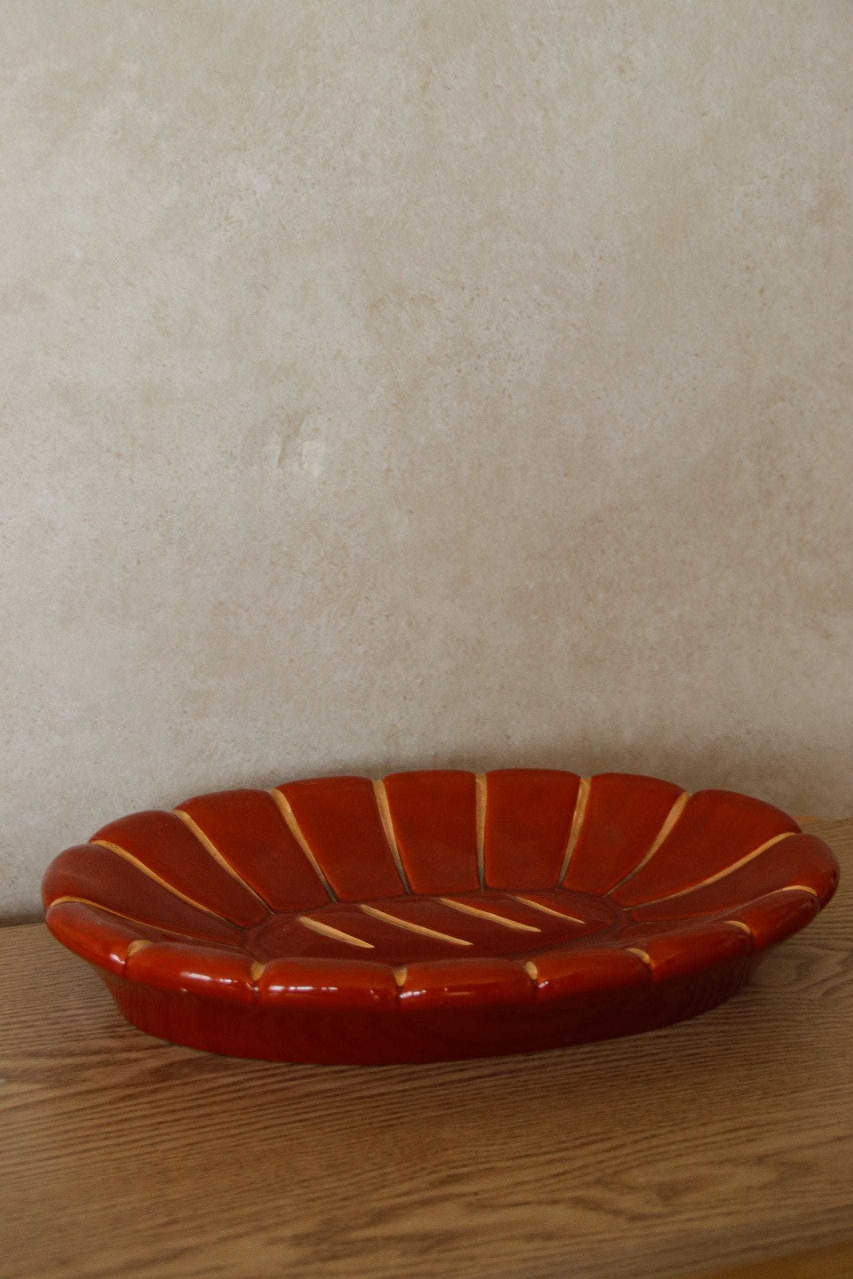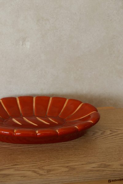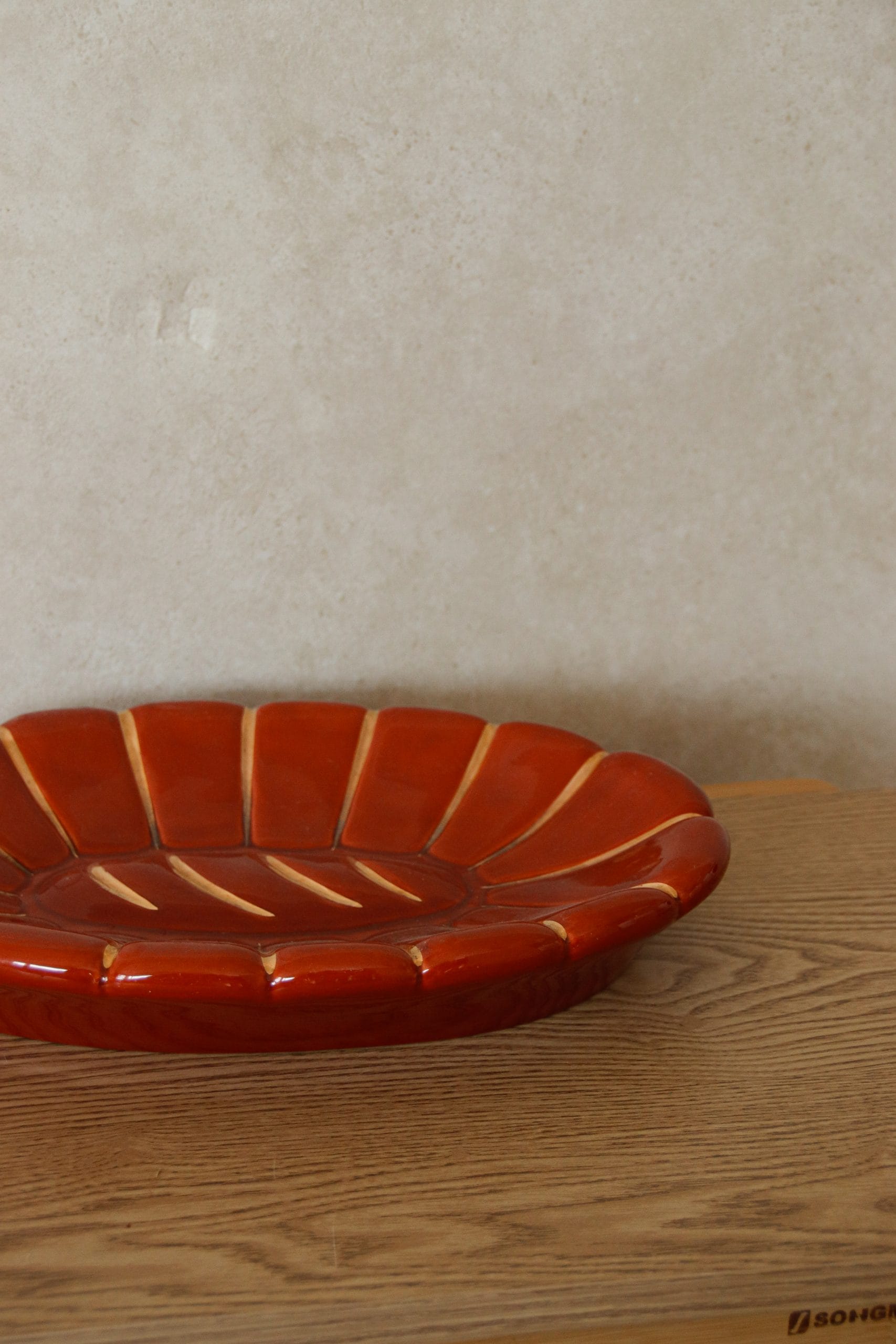 Ce plateau décoratif bordeaux et doré présente des bords ondulés et une finition vernis brillant qui met en valeur sa teinte chaleureuse. La dorure, légèrement passée par le temps, ajoute un charme vintage à l’ensemble. Idéal pour présenter des fruits, par exemple.