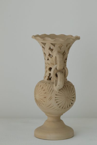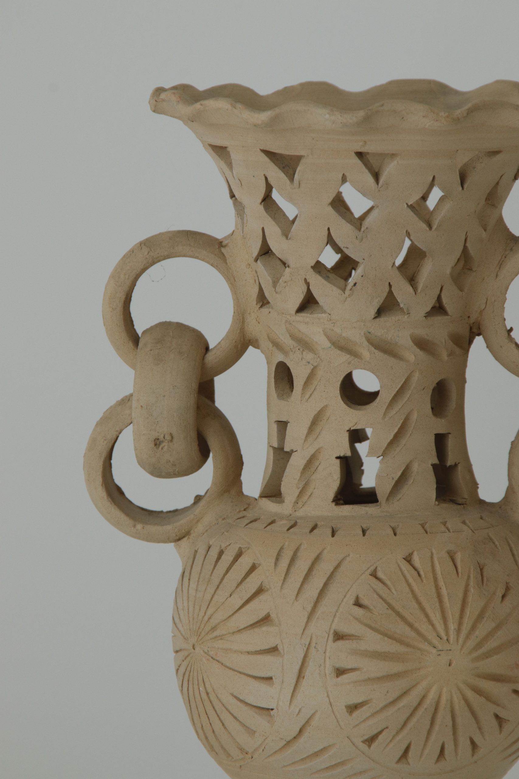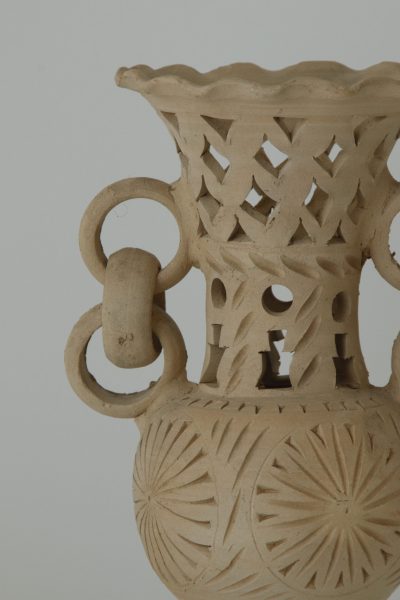 Ce vase berbère en terre cuite, est une pièce de caractère, arborant un design ajouré sur le dessus et des motifs gravés directement dans la terre sur sa partie inférieure. Ces ciselures évoquent l’architecture orientale et reflètent la couleur naturelle de la terre.