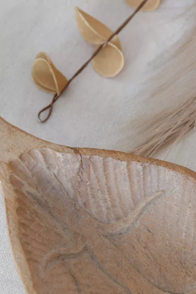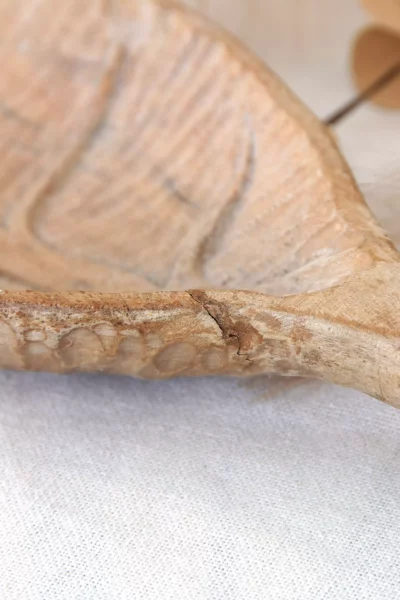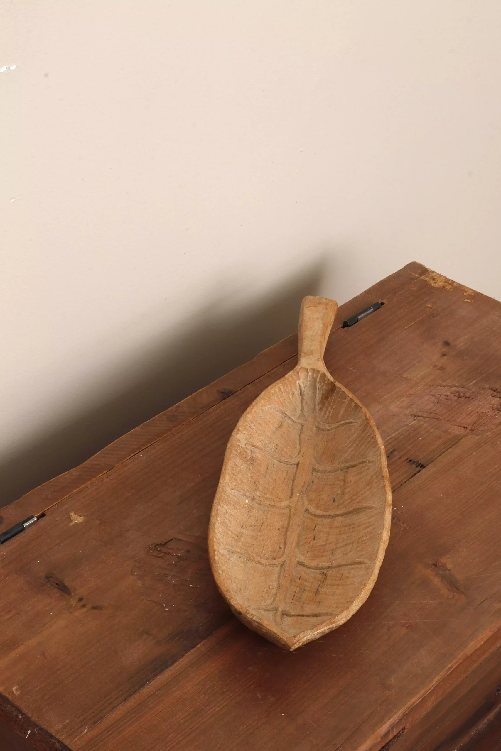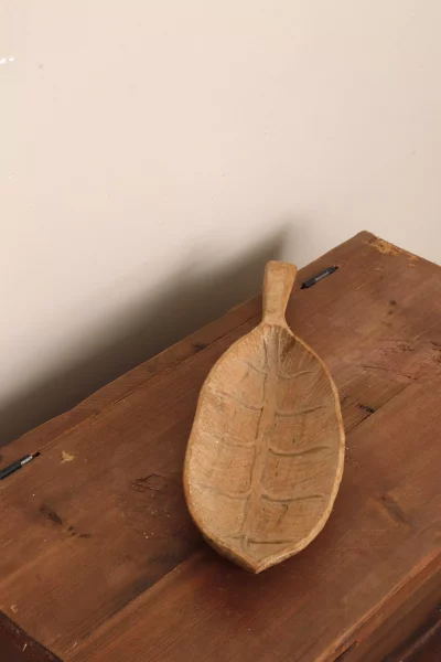Plat ou vide-poches en forme de feuille. Il s’agit d’un bois flotté creusé laissant apparaître une belle silhouette végétale, jusqu’aux veinures de la feuille apparentes. Parfait comme plat à apéritifs ou vide-poches.