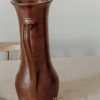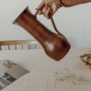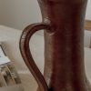 Grand pichet en grès artisanal tourné à la main pouvant également servir de vase. Pièce pleine de charme pas ses petites imperfections laissant entrevoir tout le travail à la main. Emaillé dans une teinte bordeaux.