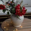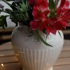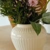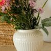 Un vase en céramique au coloris blanc cassé, orné de fines stries délicates. Sa forme flatteuse, légèrement évasée, capte l’attention tout en valorisant subtilement vos compositions florales.