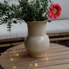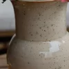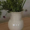 Un vase en céramique artisanale, dont la surface présente une délicate teinte beige ponctuée de fines piqûres marron, conférant un rendu naturel et texturé. Le col s’ouvre doucement vers le haut, créant une silhouette gracieuse et accueillante pour les fleurs à longues tiges.
